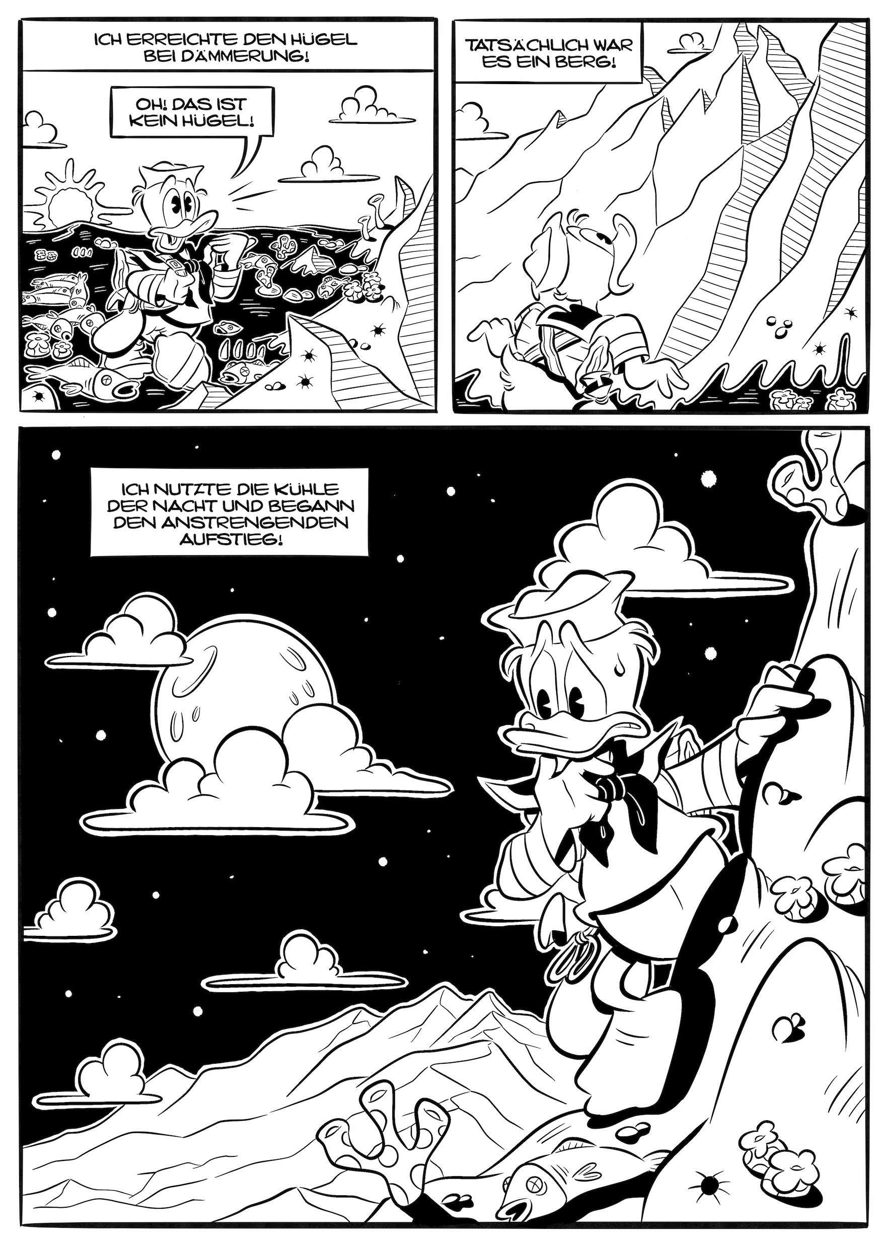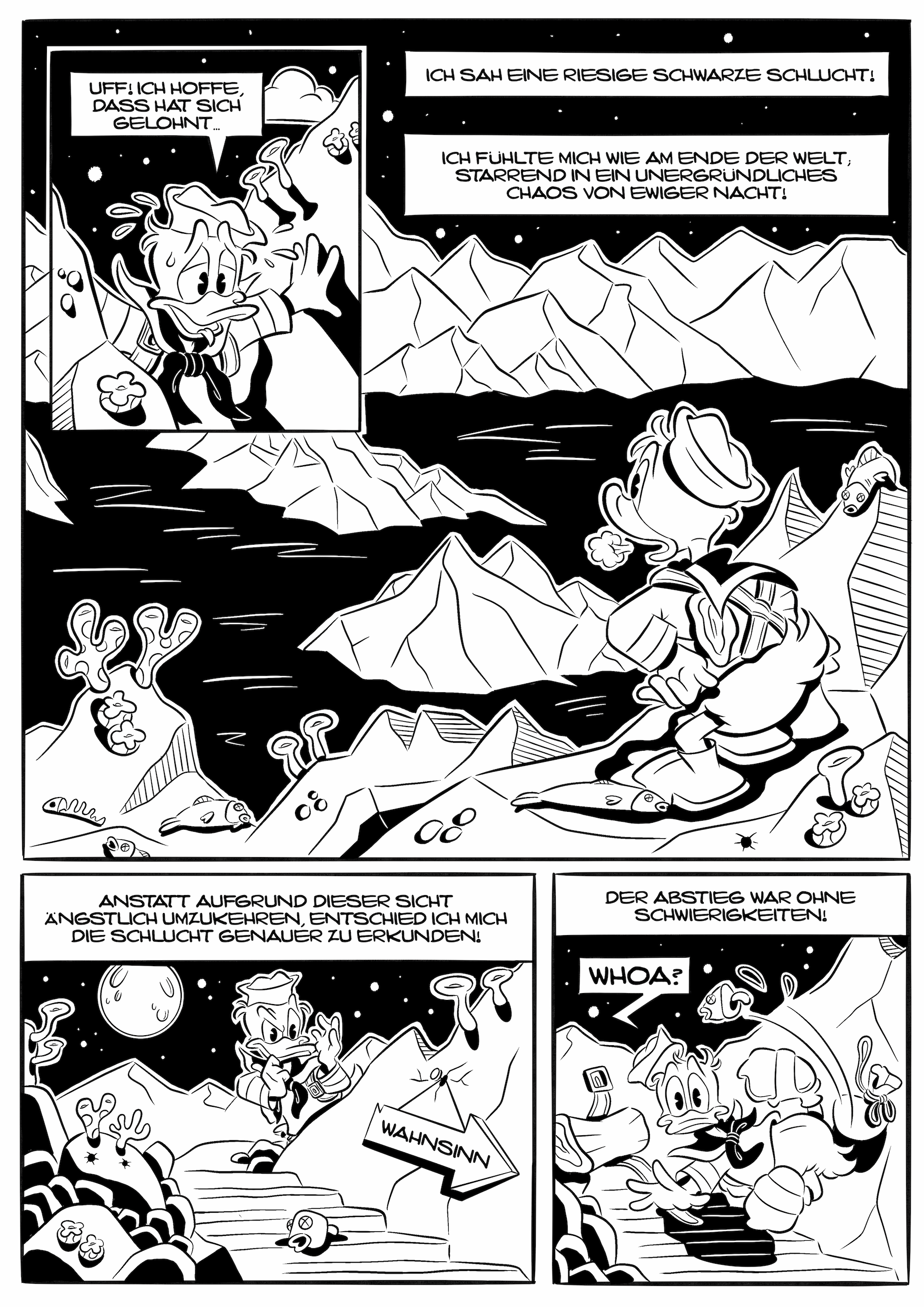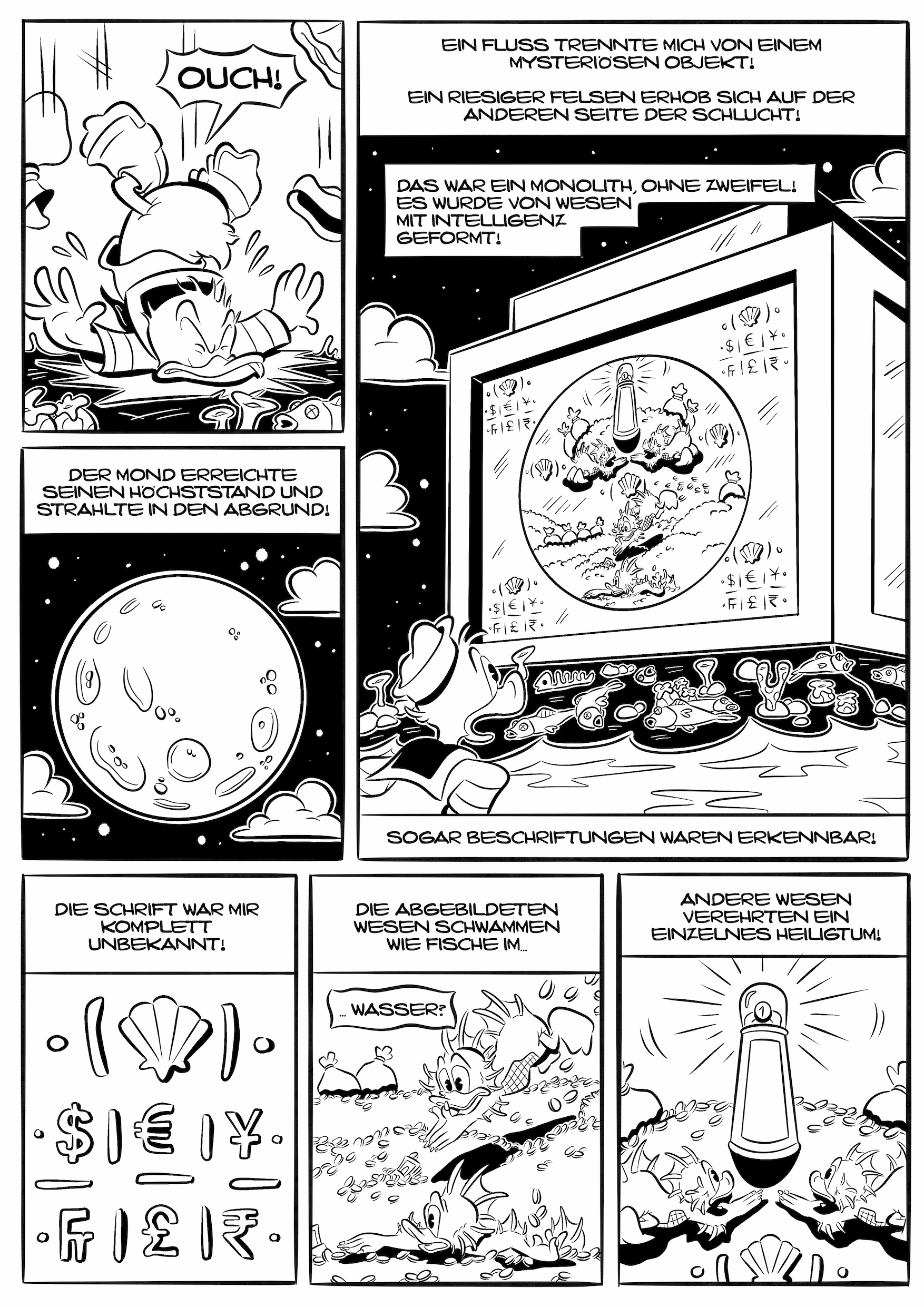 Hintergrund: Vieles in Lovecrafts früher Geschichte ist schön vage beschrieben, sodass manche Sätze komplett in einem Disney-Comic übernommen werden können. Der Gag besteht also darin, den Originaltext von Lovecraft mit Disney-Zeichnungen zu kombinieren. Wer sagt, dass der von Lovecraft beschriebene Monolith nicht wie ein Geldspeicher aussieht?
