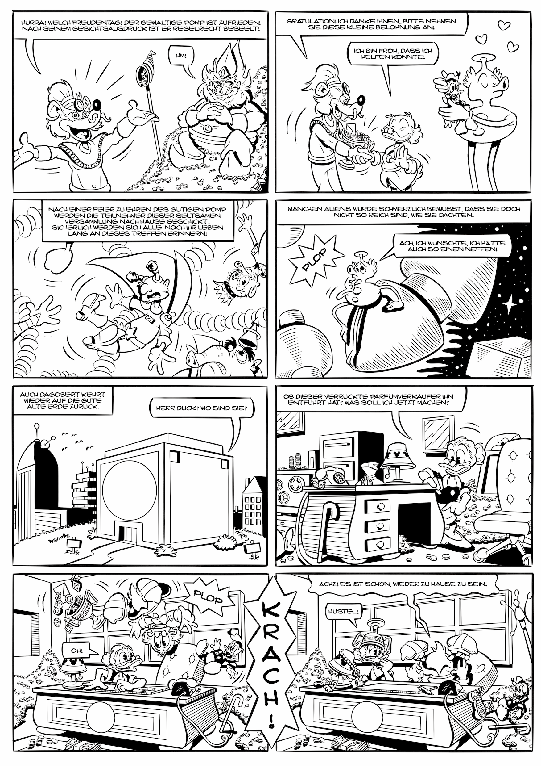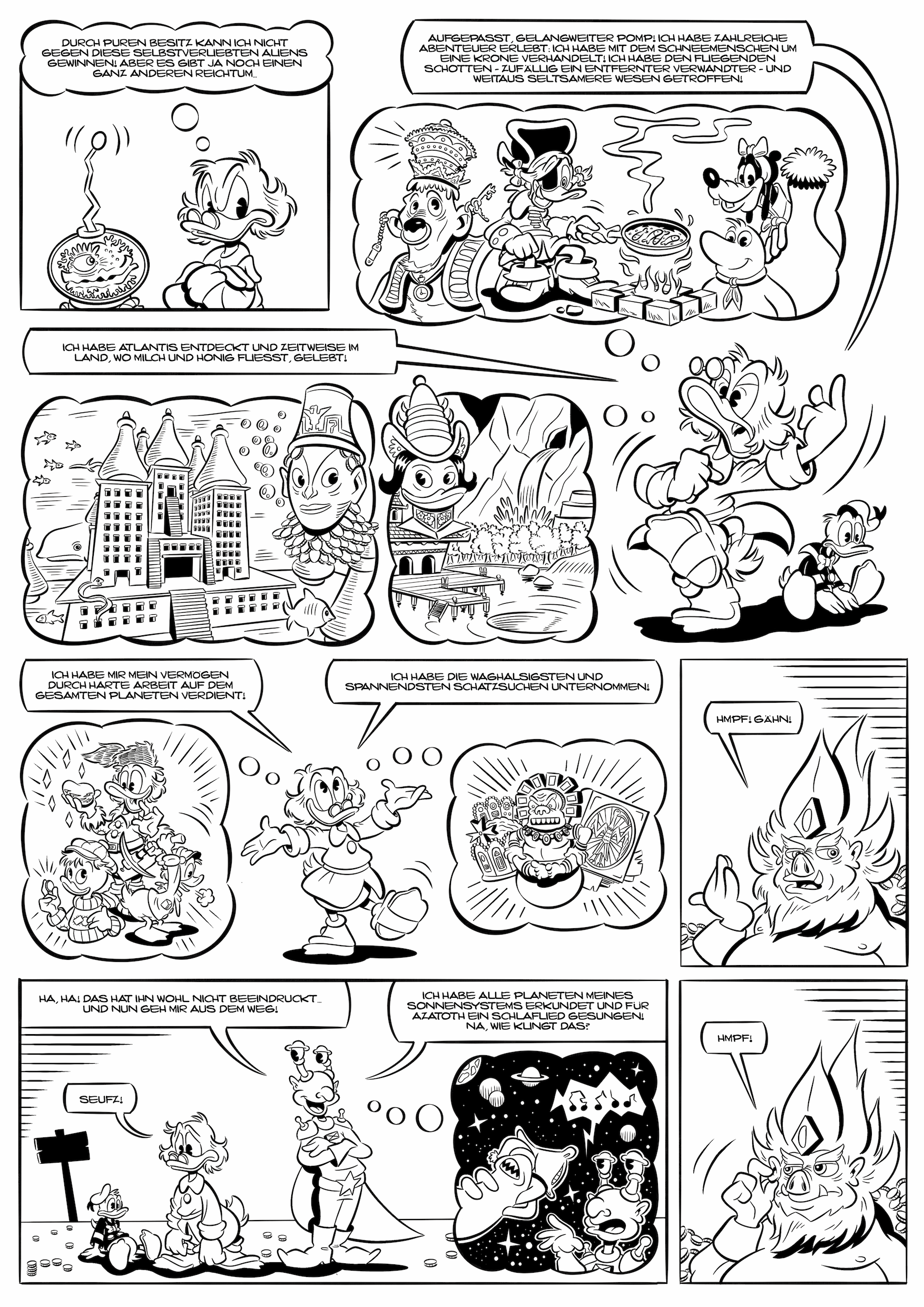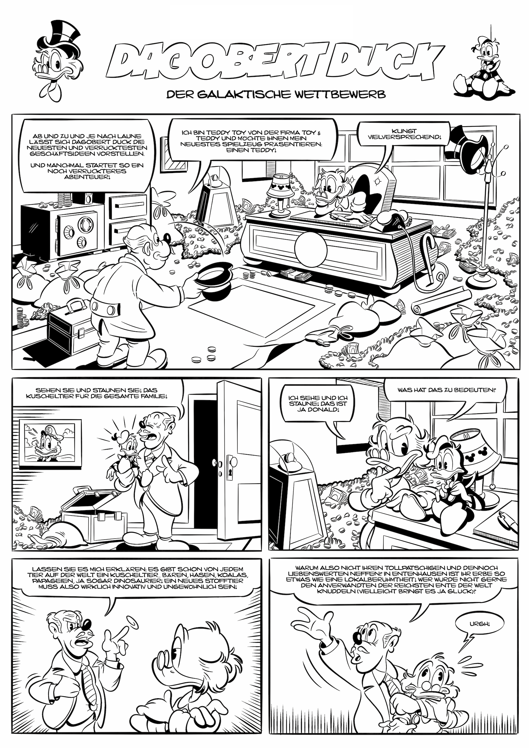 Hintergrund: Diese Geschichte wurde gleichzeitig mit „Das Ungeheuer im Geldspeicher“ als ein alternativer Achtseiter entwickelt. Gezeichnet habe ich sie dann aus Spaß an der Freude. Zusätzlich wollte ich meinen Stil weiterentwickeln. Es ist eine Dagobert-Story zum 90sten Geburtstag von Donald. Darauf muss man erstmal kommen! Ich habe viele Referenzen an bekannte Geschichten eingebaut. Neben den obligatorischen Anspielungen an Carl Barks und Don Rosa verweise ich auch auf ein paar große italienische Geschichten (Ducklas MacDuck!). Es sind wieder nur acht Seiten, daher liegt auch hier der Fokus auf eine simple Botschaft. Happy Birthday, Donald!
