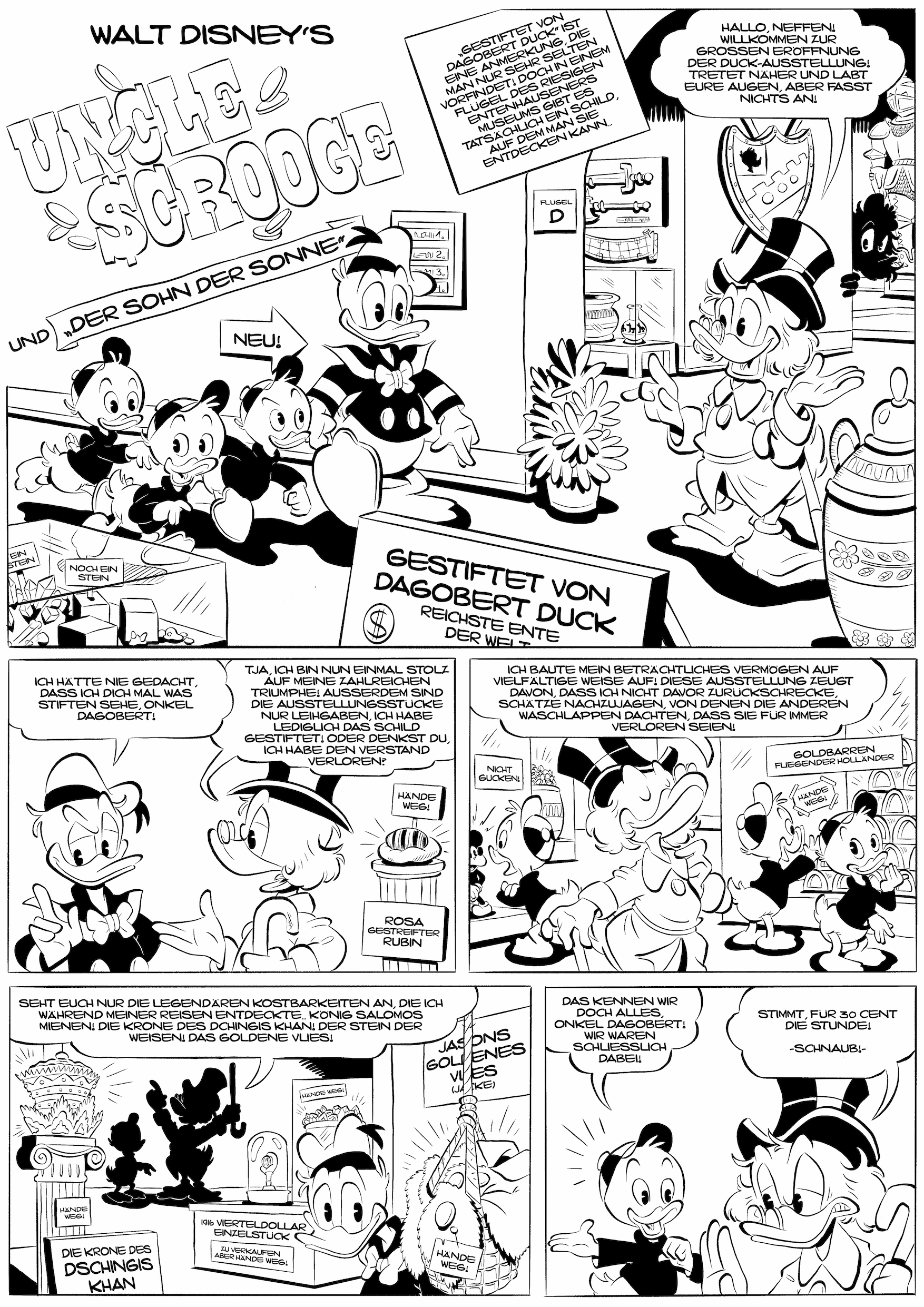 Hintergrund: Ich erinnere mich an einen Kommentar von Don Rosa: Er überlegte, seine erste Geschichte neu zu zeichnen. Er wollte eine Seite ergänzen, in der Mac Moneysac Donald und den Neffen die Ursachen für seinen Hass auf Dagobert erzählt. Die Ursache wurde dann ja in einem Kapitel von „Sein Leben Seine Milliarden“ erzählt. Eigentlich ist das eine nette Idee für Don Rosas Rente, doch er will ja nicht mehr zeichnen. Also mache ich das jetzt. Außerdem kann ich dann die Positionen der Enten verändern, damit sie nicht mehr wie Kopien von Barks aussehen.